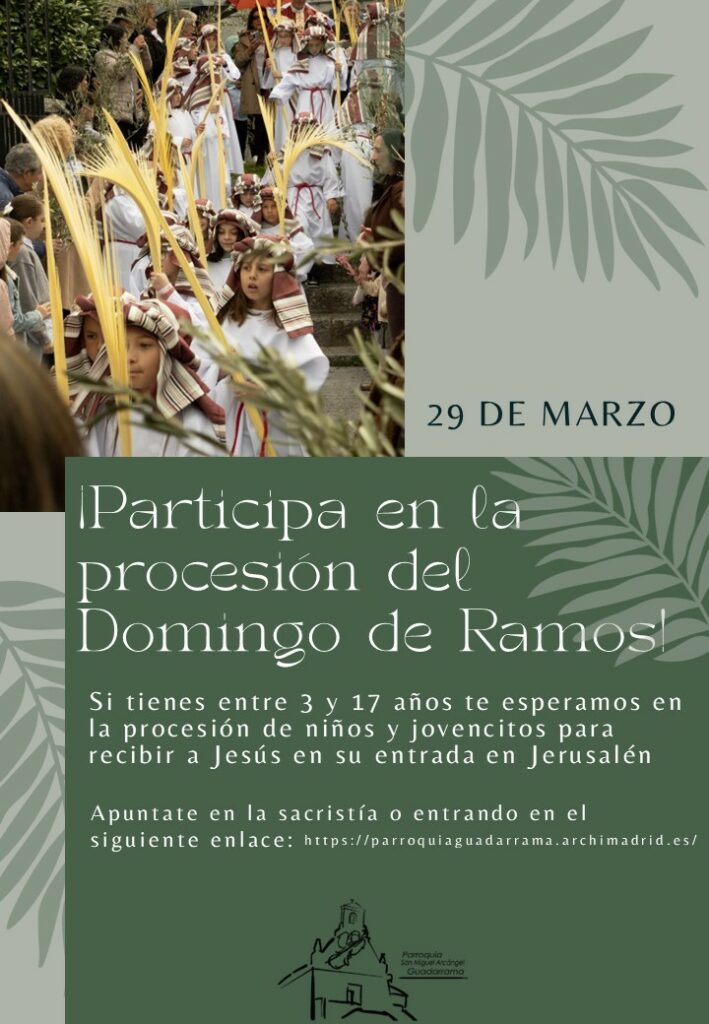 Se acerca la Semana Santa y queremos darle un impulso a nuestras tradiciones. Os proponemos que los más pequeños participen de un modo especial en la bendición y procesión de Ramos que tendrá lugar el Domingo 29 de marzo a las 12:00 h. Para ello, contaremos con túnicas blancas y pañuelos que os prestaremos en la parroquia y palmas que después se podrán llevar a casa.